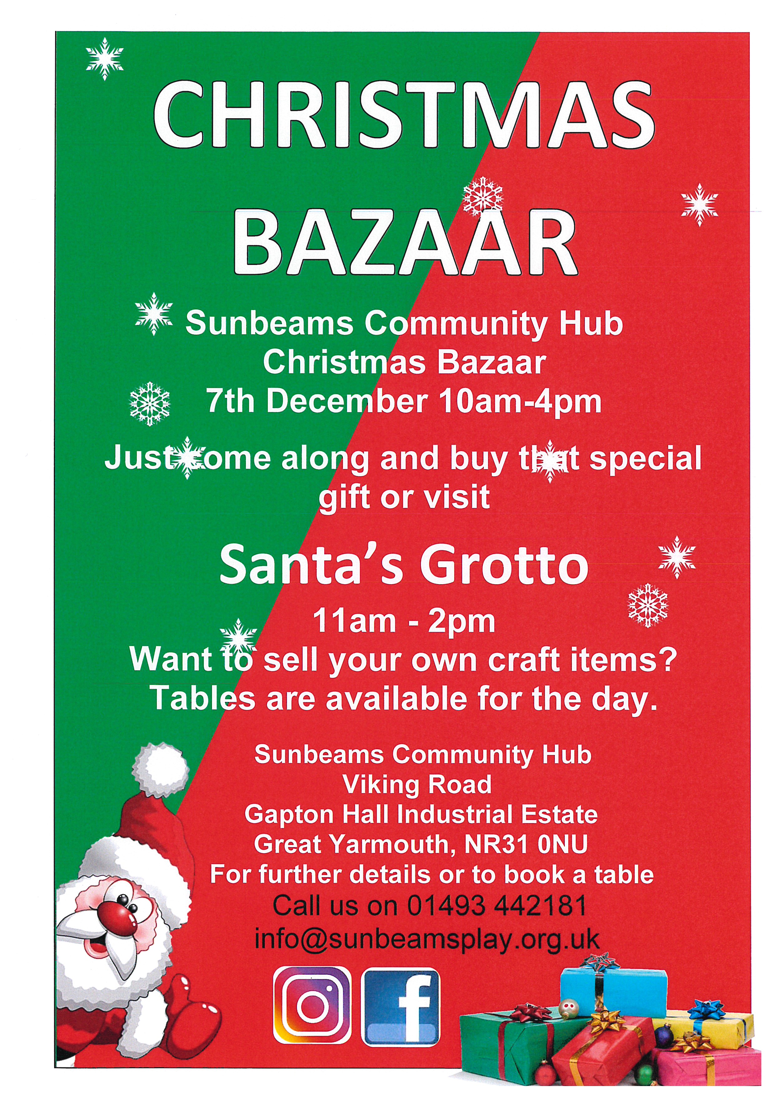 Sunbeams Community Hub will be holding the annual Christmas bazaar on the 7th December 10am-4pm. come and visit the craft stalls made by local people, sell your own crafts or visit Santa in his grotto.