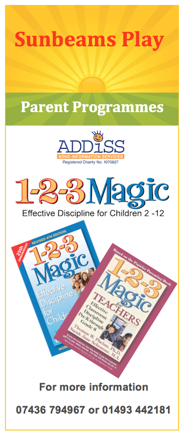 The 1-2-3 Magic programme runs for 2-2½ hours a week for 4 weeks and is FREE for parents and carers of Sunbeams Play children and young people.